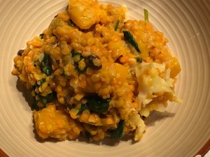 - En fin de cuisson, ajouter la chair de butternut cuite vapeur, le chou fleur cuit vapeur, le jus de citron et les épinards frais.